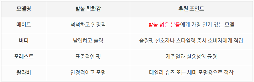무게감 매우 가벼움 (한 짝 약 200g 내외) 메이트보다 살짝 더 묵직한 착화감