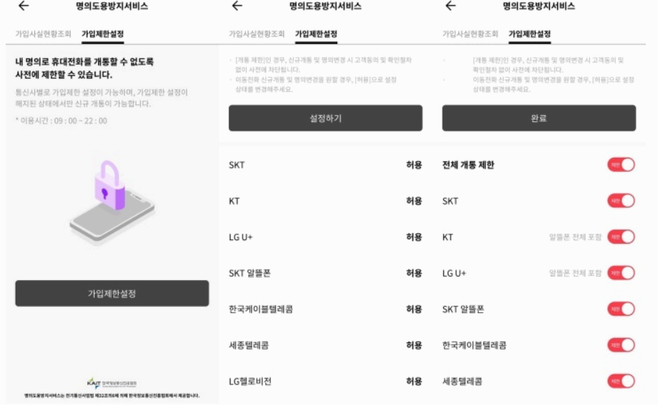 타인이 내 명의를 도용해 이동전화 개통(신규, 번호이동, 명의변경 등)을 사전에 차단 하는 서비스가 입니다.